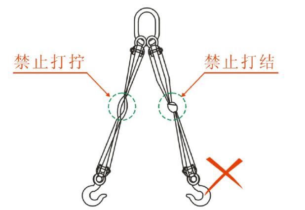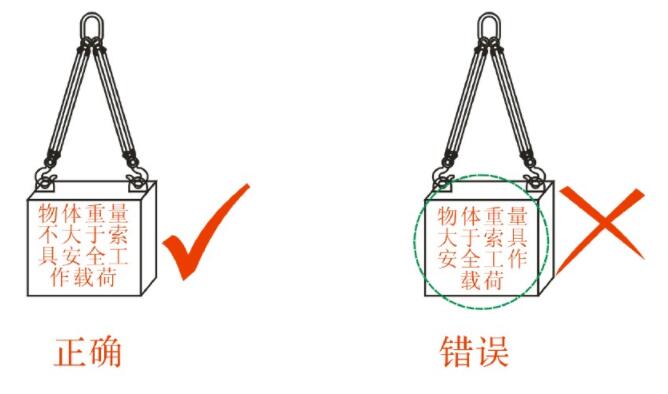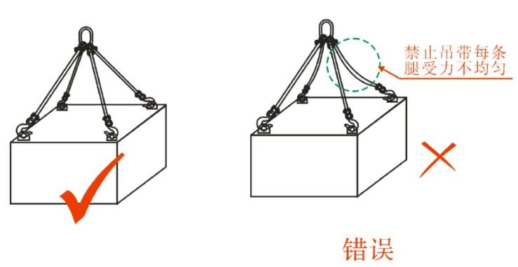 4、成套索具(兩腿、三腿、四腿)使用過(guò)程中,嚴(yán)禁單根吊帶索具受力,應(yīng)使用負(fù)載均勻分布在每條腿上。